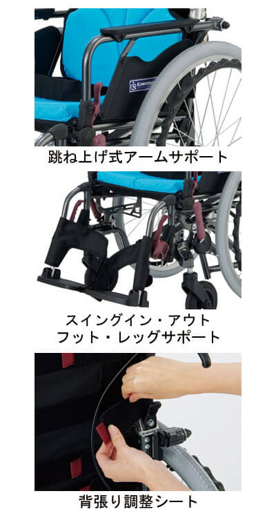 移乗がしやすい多機能タイプの車いす。背中の形状に合わせて、横方向の張り調整ができます。