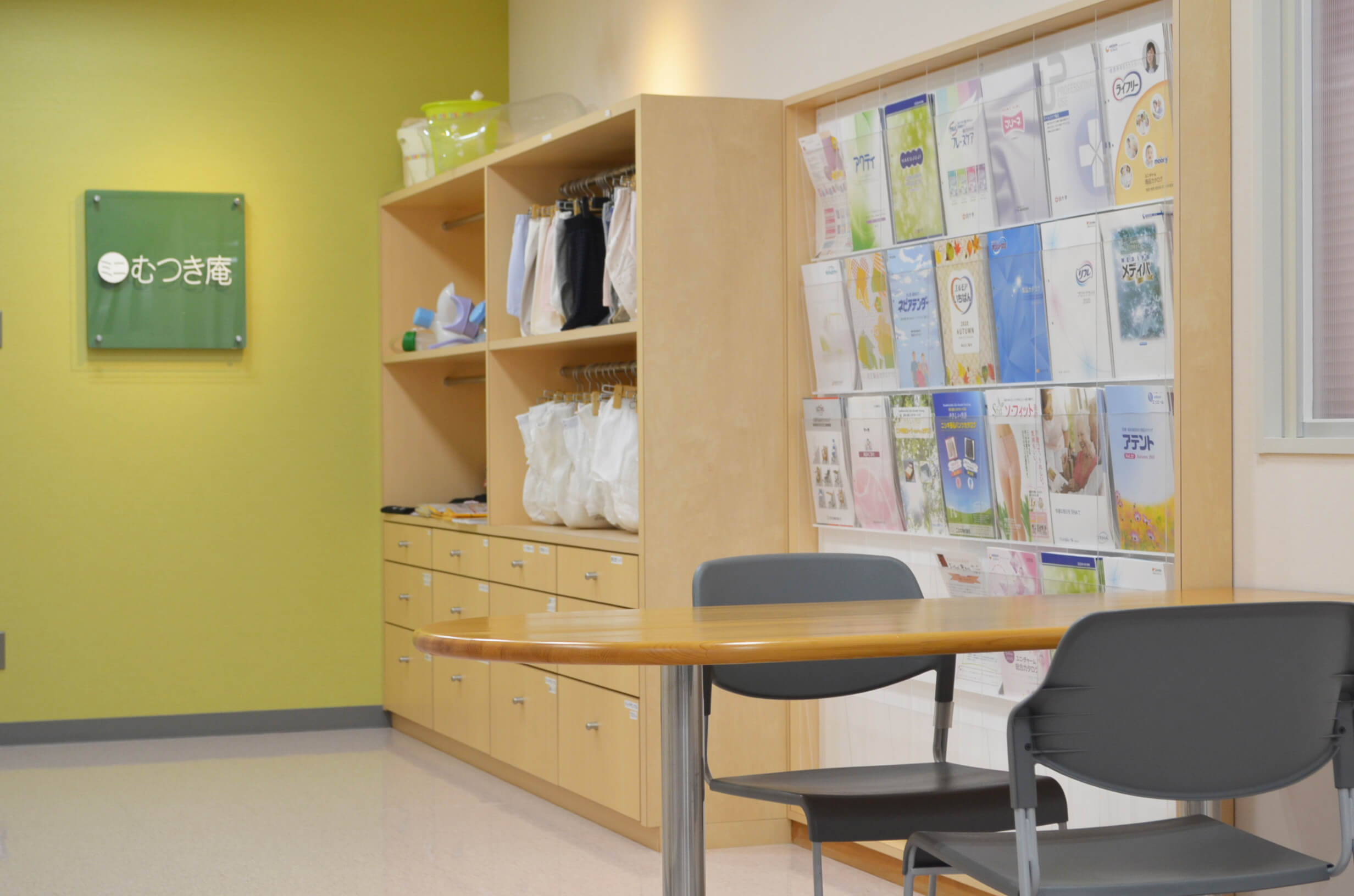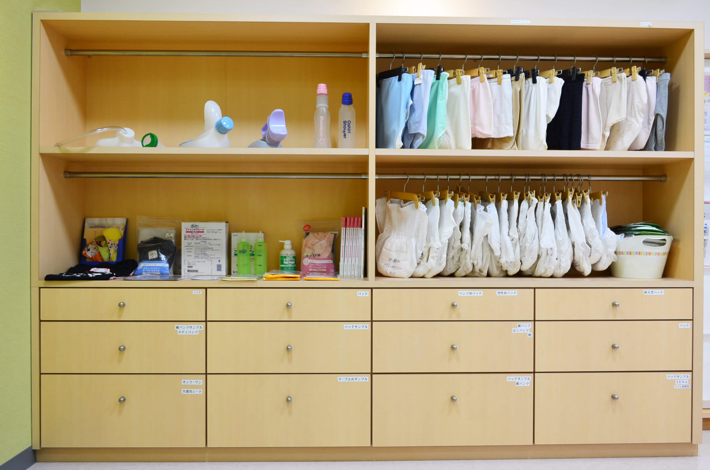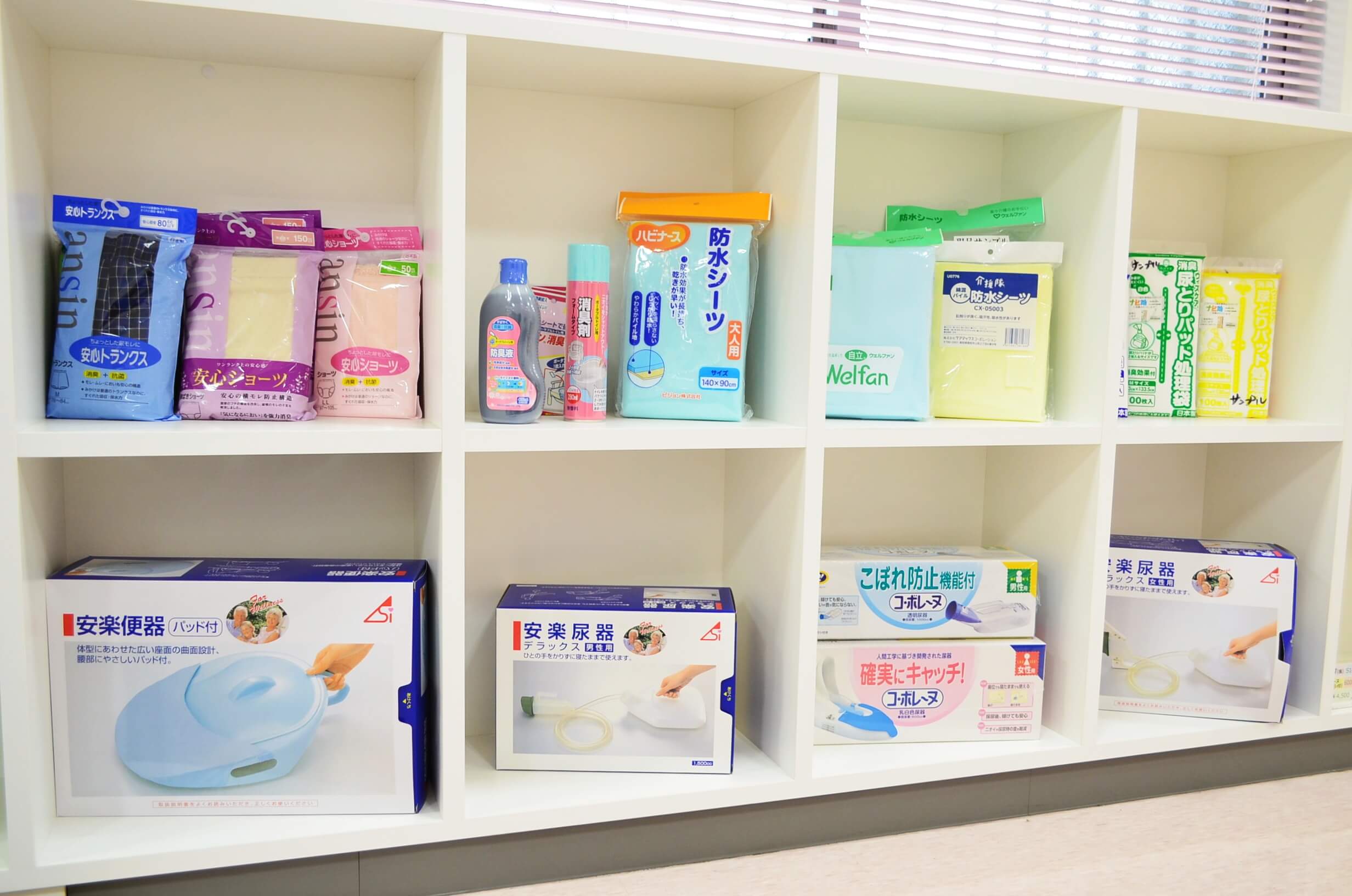 aico 朝倉ショールームに併設するミニむつき庵では、おむつ、パンツ、ポータブルトイレなど、排泄関連用具をたくさん展示しています。実物を見て・触って、お選びいただけます。