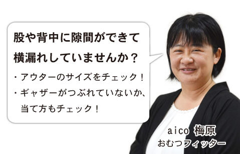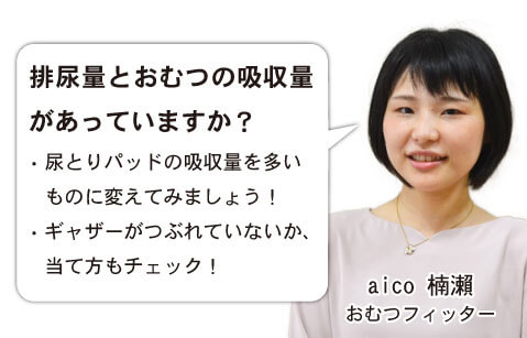 同じ「おむつをしているのに漏れる」という相談でも、原因が違えば解決策も変わります。その方にあった解決策を見つけるために、まずはおむつフィッターにご相談ください。