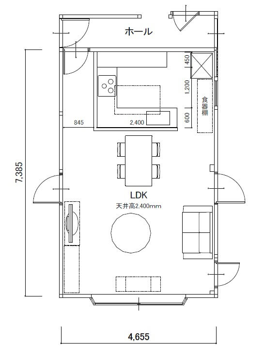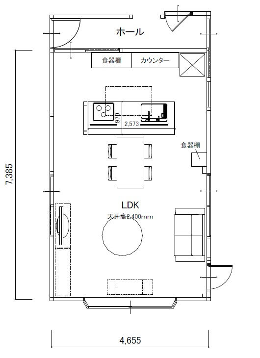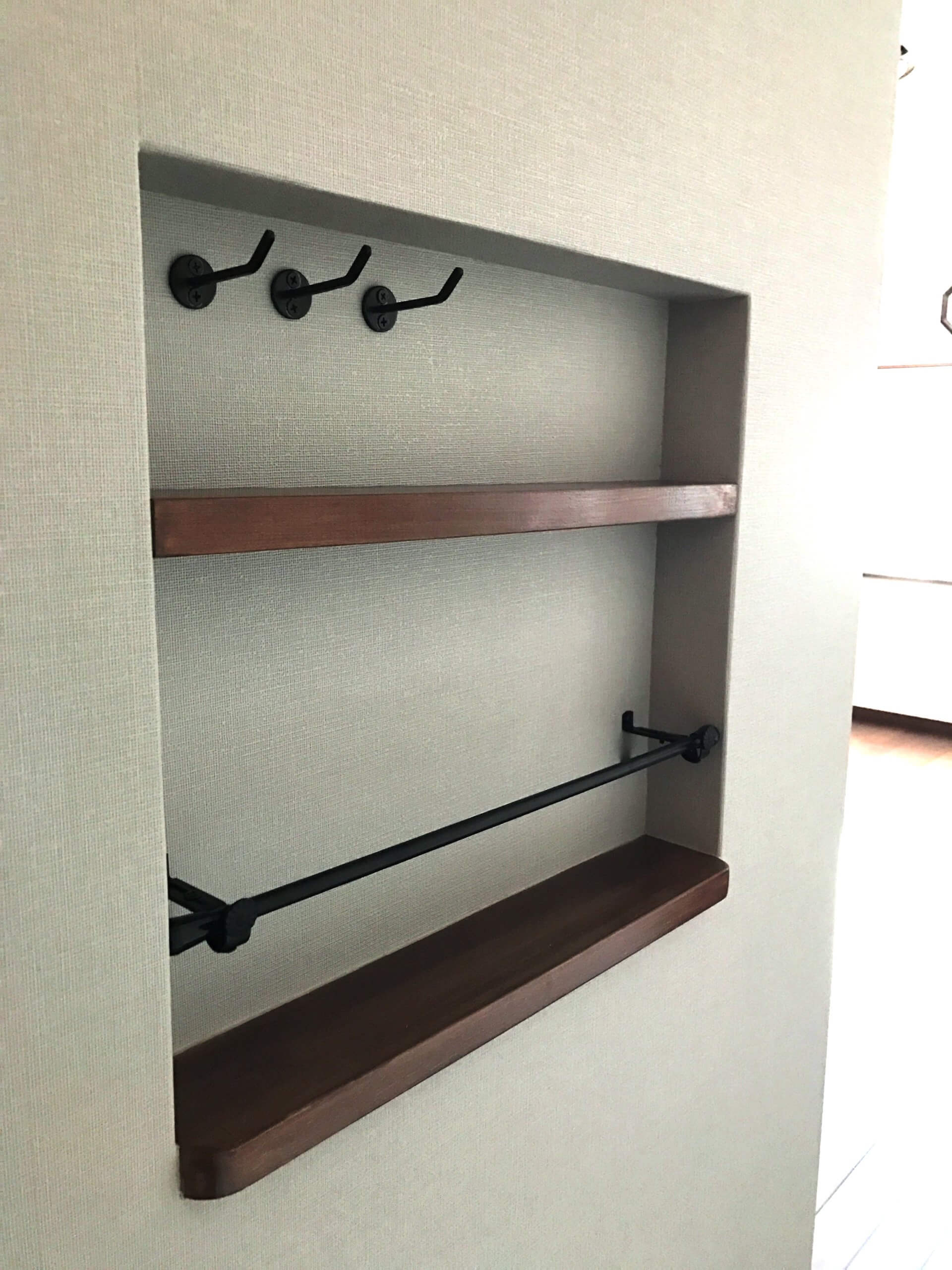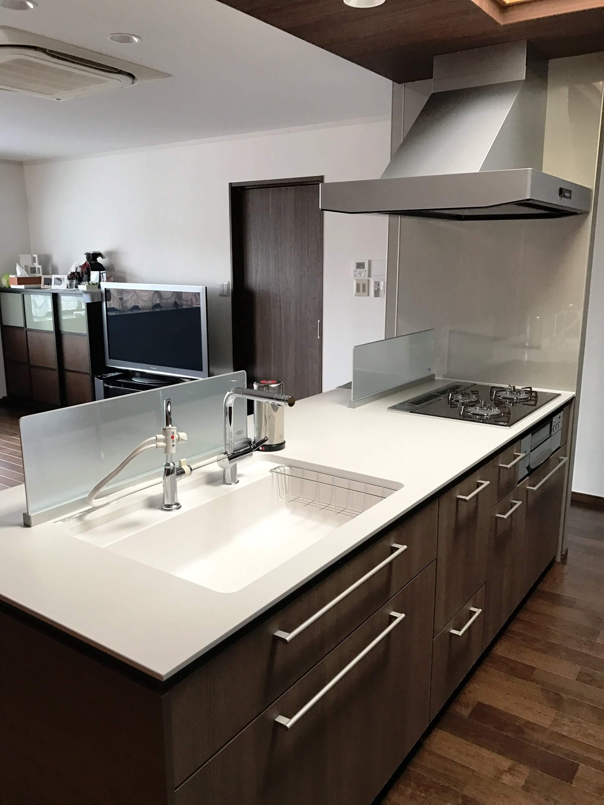 キッチンがコの字の壁に囲まれていましたが、ロボット掃除機が使えるよう、アイランドキッチンとリビングをワンフロアにリフォームしました。ガスコンロ横は汚れが飛び散るため壁を設置し、裏面を鍵などの小物を置けるニッチ収納に。