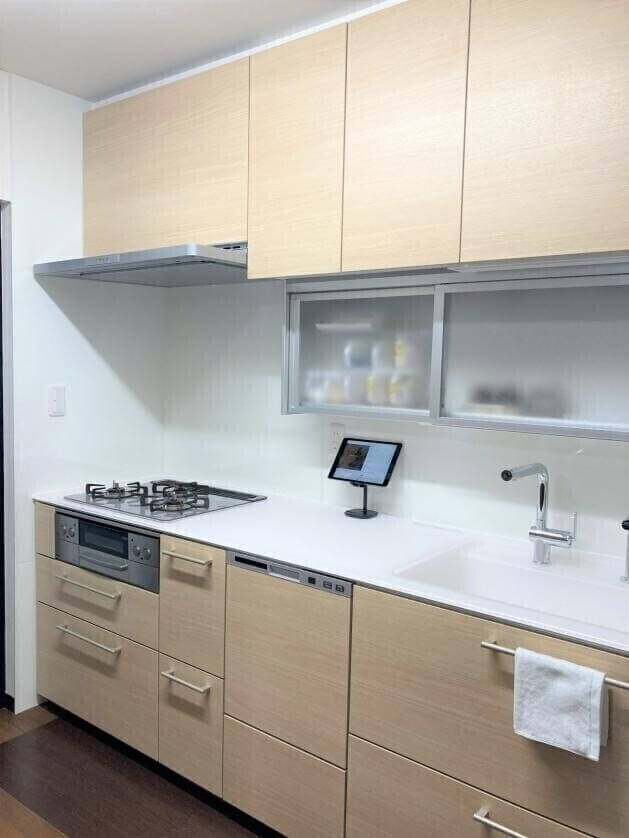 以前浴室・洗面所・トイレのリフォームもご依頼いただき、その際にTOTOの商品を取り付けたため、今回キッチンもTOTOをご希望されていました。老後のことを考えて、よく使うものはすぐ取り出せる位置に置きたいとお伺いしていたため、アイキャッチウォールをご提案させていただきました。