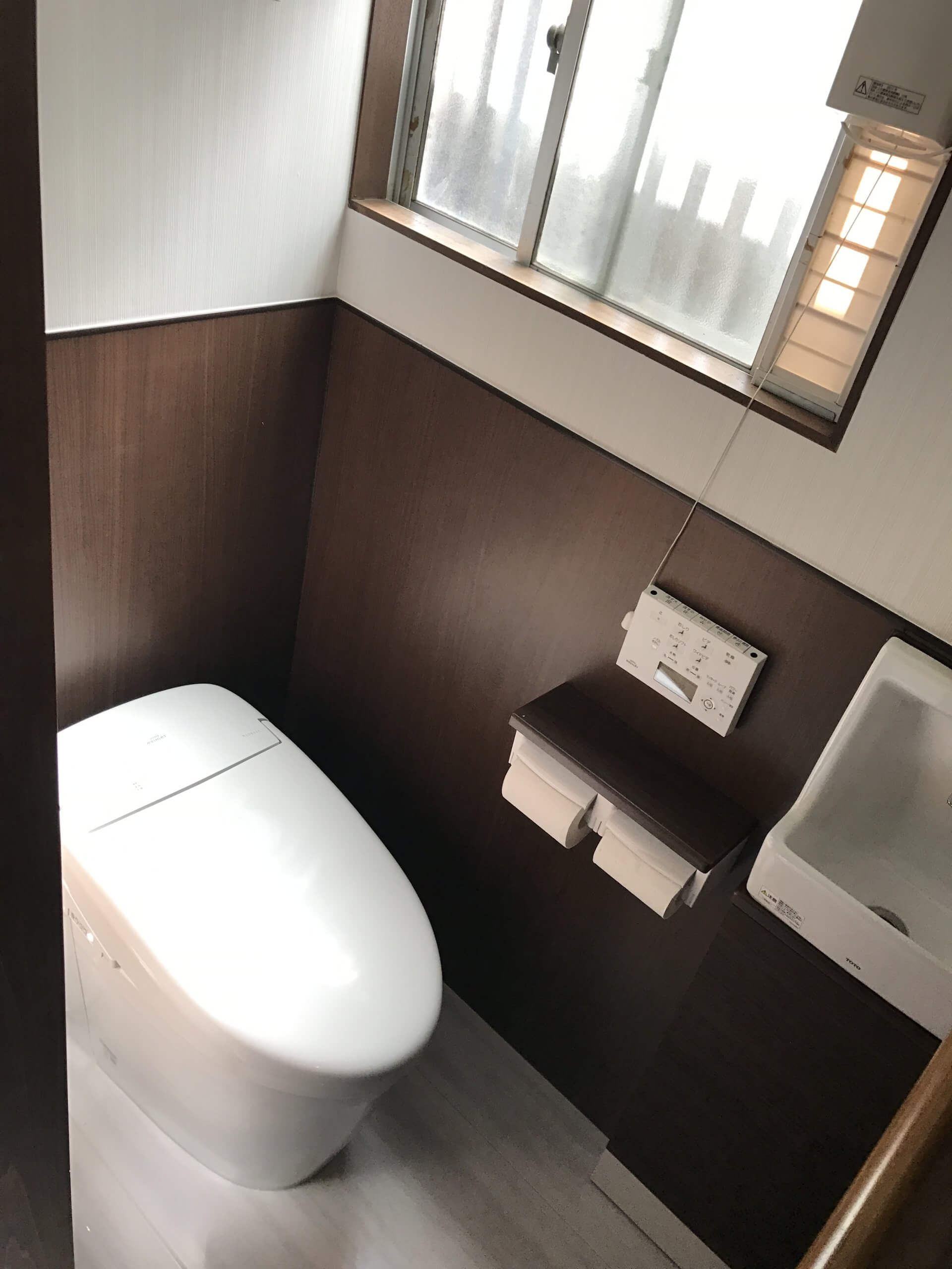 80代男性の一人暮らしのお宅。水漏れをきっかけに、使い勝手がよく、快適なトイレに改装。 将来同居予定のお孫さんの希望を取り入れて、内装は白と木目の2種類で統一しました。